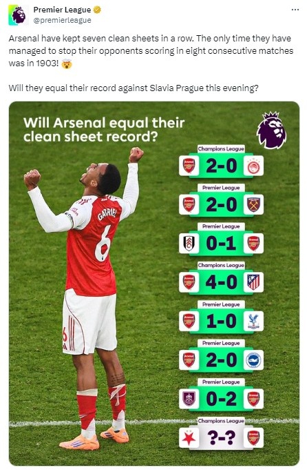 英超官方推特写道:“阿森纳已经连续7场赛事 保持了零封,他们上一次连续8场零封对手还要追溯到1903年。”