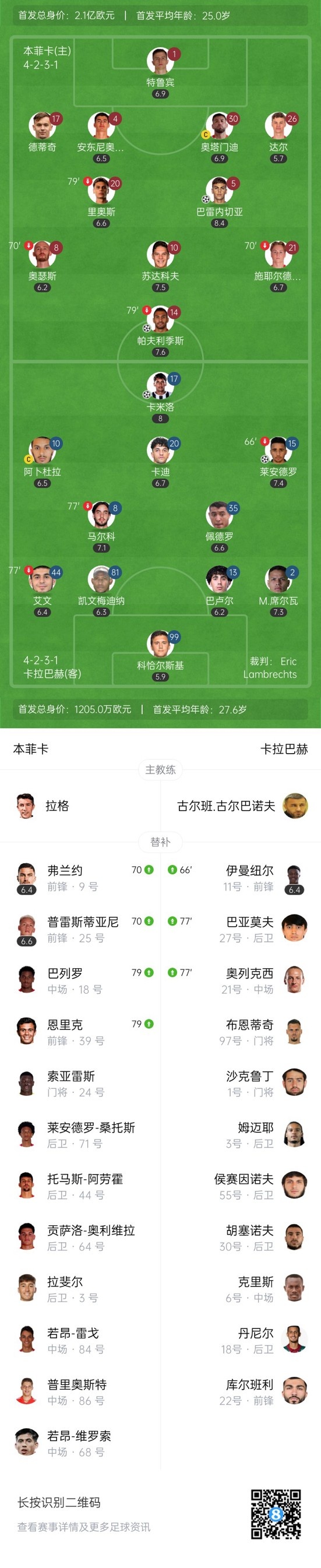 两队杆位阵形 身价也相差巨大,欧洲杯直播吧本菲卡身价2.1亿欧元,卡拉巴赫只有1200万。