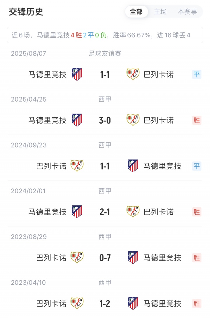 马竞职业联赛 1胜3平1负暂位西甲第12,欧洲杯直播吧近2场不胜;巴列卡诺1胜2平2负积5分暂位第14,近3场不胜。马竞各赛事对阵巴列卡诺已连续18场不败(14胜4平)。