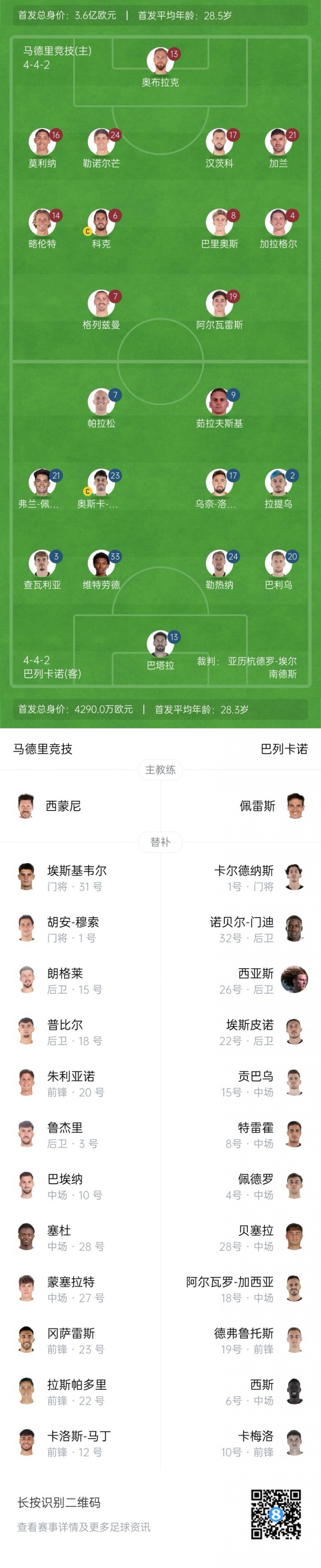 马竞vs巴列卡诺杆位:格列兹曼、阿尔瓦雷斯先发,略轮特出战