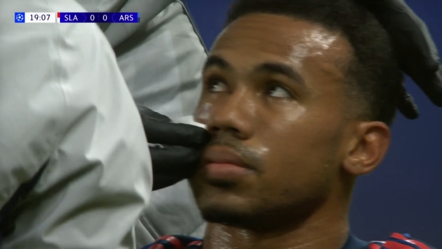 11月05日讯 欧冠阿森纳vs布拉格斯拉维亚第18分钟,加布里埃尔被击中面部,