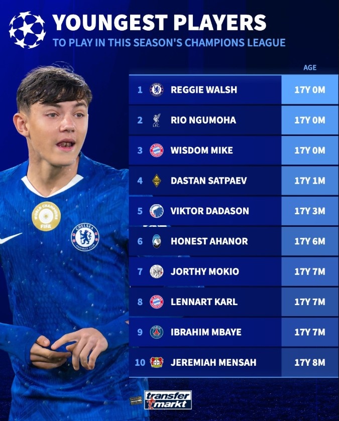 本赛季欧冠赛场最年轻球员排行:恩古莫哈、伦哈特-卡尔在列
