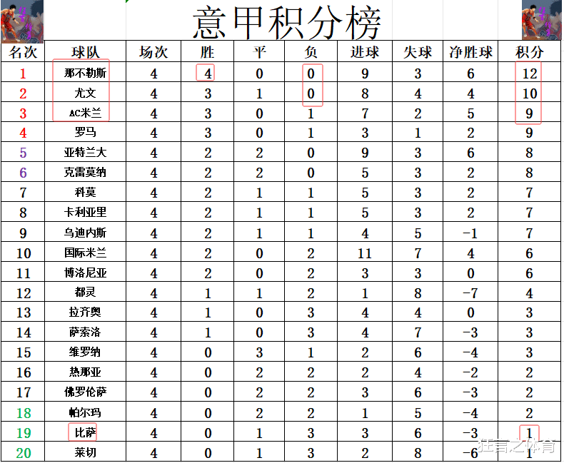积分榜方面,那不勒斯今天小胜比萨后,成为新赛季唯一保持全胜的球队,超过尤文,AC米兰夺回榜首,多尤文2分,多AC米兰3分。比萨输球后,还是倒数第2陷在降级区。
