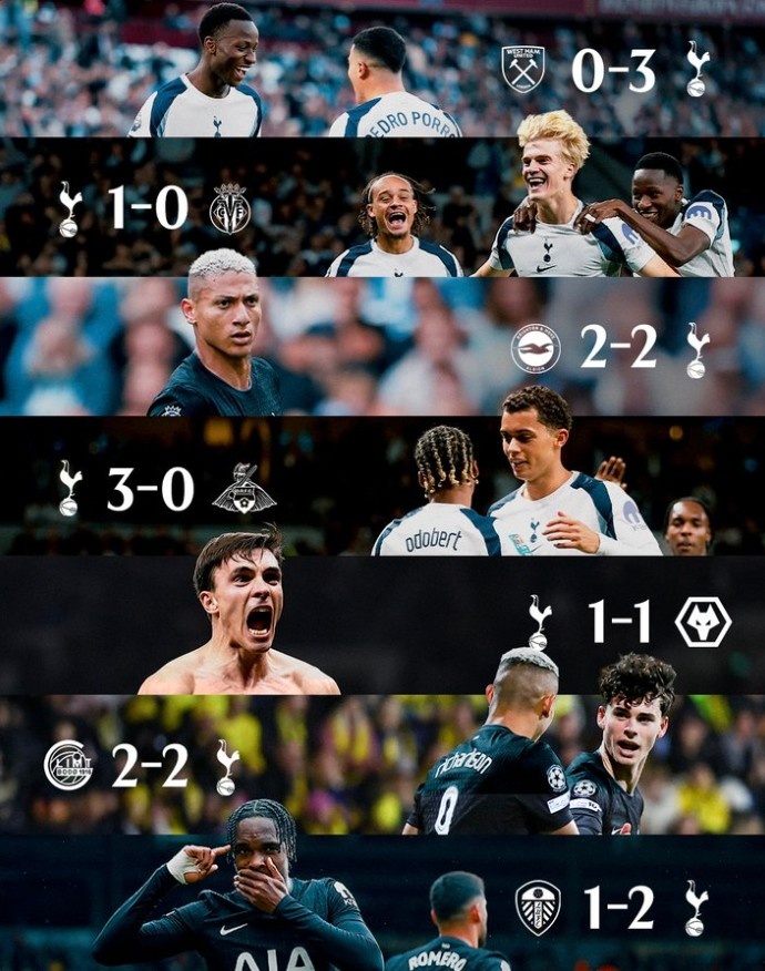 赛后热刺官方晒出了球队近期的战绩:3-0西汉姆、1-0比利亚雷亚尔、2-2布莱顿、3-0唐卡斯特流浪、1-1狼队、2-2博德闪耀、2-1利兹联。