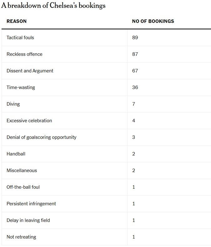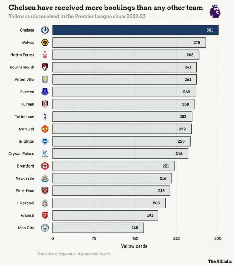 2022-23赛季以来,切尔西英超吃到301张警告 远超其他球队