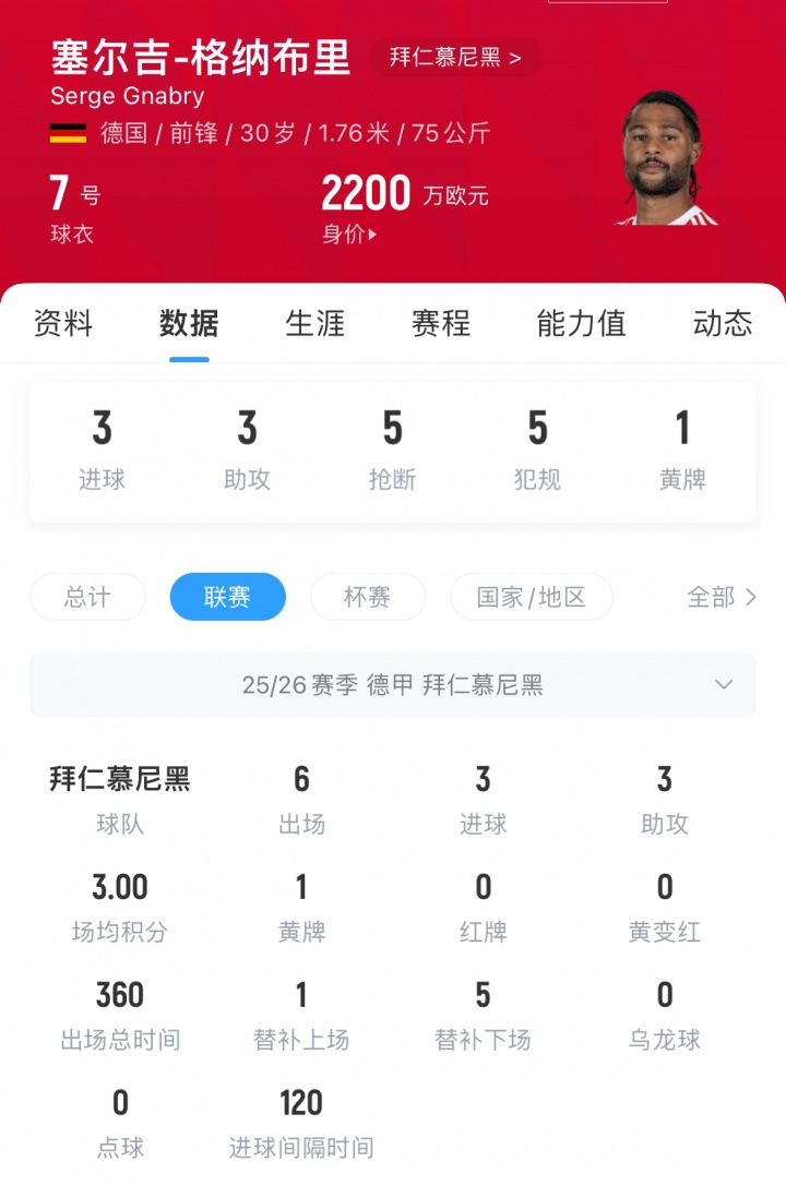 本赛季,由于穆西亚拉的负伤 ,孔帕尼将格纳布里改造为前腰,这一改变使得格纳布里焕发新生,一改前两个赛季的糟糕表现。本赛季至今,格纳布里各项赛事为拜仁出场15次,足球直播无插件免费在线观看贡献3球5助,其中德甲6轮贡献3球3助。