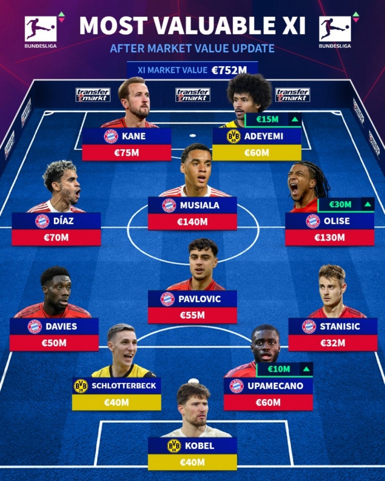 德甲最贵阵形 :拜仁8人+多特3人 穆西亚拉1.4亿欧、奥利塞1.3亿欧