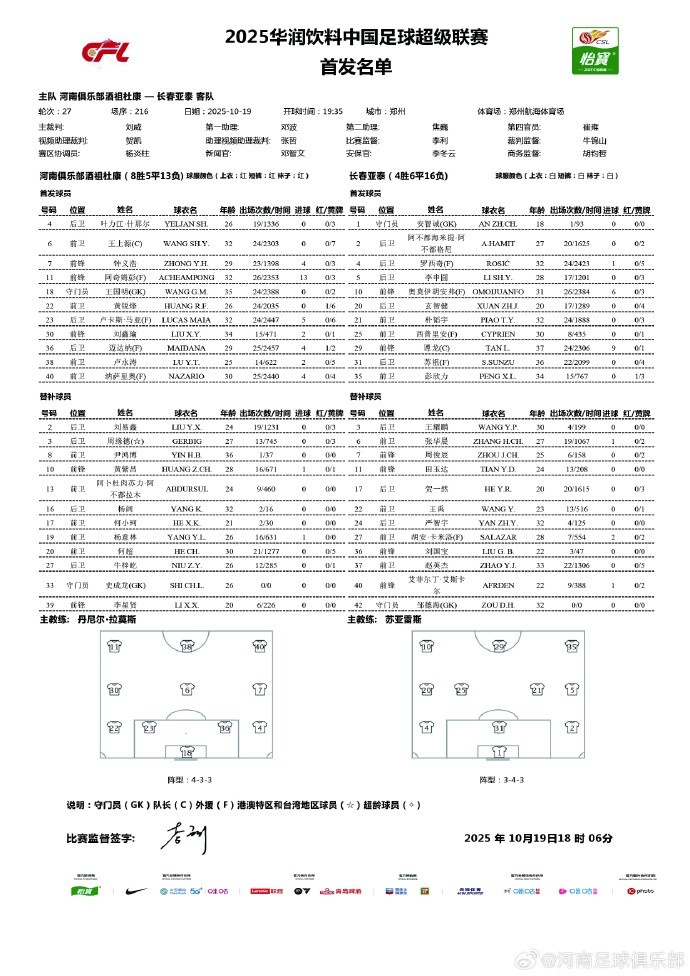 中超第27轮,河南俱乐部酒祖杜康VS长春亚泰 杆位及后备 队员名单