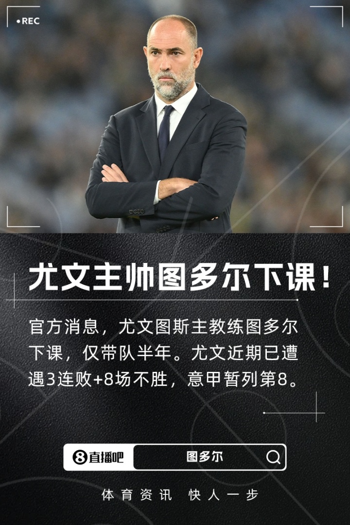 3连败+8场不胜!官方:尤文主帅图多尔下课,上任仅半年