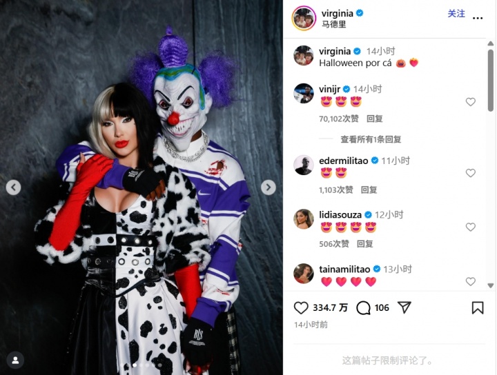 10月30日讯 万圣节即将到来,维尼修斯女友弗吉尼亚在社媒上分享了自己与维尼修斯的万圣节装扮。